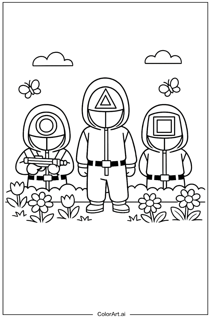 Dive into creativity with 44 free squid game coloring pages! Enjoy fun designs like "squid game in a Garden 1" and "Happy squid game 1." Download now!